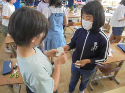 この単元で学習をした表現を自信を持って話すことができました。学習の最後には、友だちの名刺がたくさん集まりとても嬉しそうな子どもたちでした。
