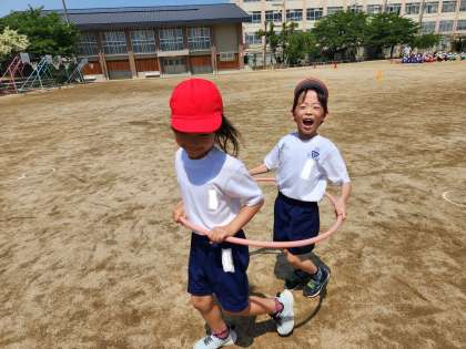 縄跳びをしたり…、電車にしてみたり…。フラフープ一つで、たくさんの遊びができることを知りました!