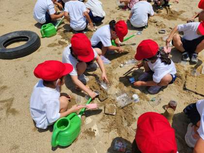 水をかけて土を湿らすと、お団子が作りやすいな〜。このカップの形だったら、お城が作りたいな〜。など、様々なことに気づいたり、考えたりする様子が見られました。