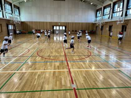 体育館での体育の前に体ほぐしをしました。