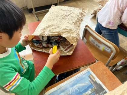 図画工作科で「くしゃくしゃぎゅっ」の学習をしました。