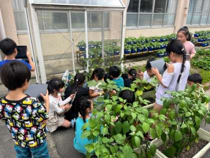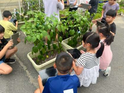 できたナスやピーマン、オクラを見て、子どもたちは大喜び!