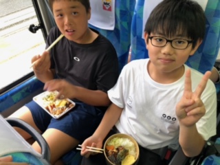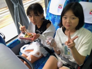 高速道路の状況により、広島への到着が遅れる模様です。そのためバスの中での食事になりました…。が、屋外の暑さに打ちひしがれながらの昼食よりも、案外快適な昼食になっているとの情報も。車窓を眺めながら、友達と食べるお弁当はこれまた趣深いものです。