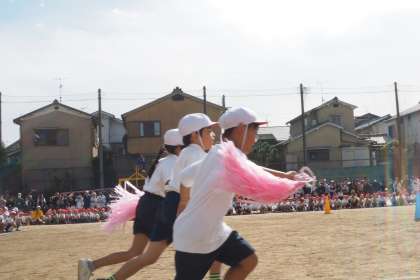 台風の目では、各チームは走って、とんで、まわって・・・最後まで全力でやりきりました。80m走では、校舎まで走りこむ勢いで走りきました。子どもたちはいつもより緊張していましたが、応援してくれる先生や家族、他学年の友達のおかげでやりきることができました。ありがとうございました。