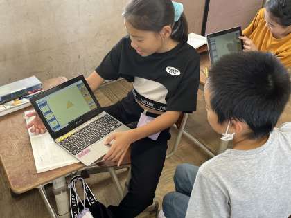 今回の授業では、三角形の面積の求め方を考える学習をしました。タブレットを使って三角形を切ったり、付け足したりすることで今までに学習をしている長方形に変形できることに気づき、面積を求めることができました。