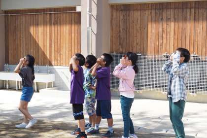 写真は、遮光板で太陽を観察している様子です。