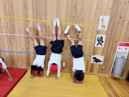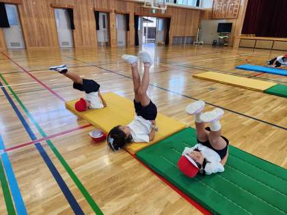 今日の体育の学習ではマットあそびを行いました。「きょうとタワー」や「川とび」など、さかさ遊びやぴょんぴょん遊びに挑戦しました。