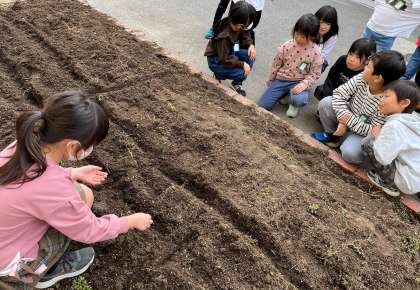 生活科「ぐんぐんそだてわたしのやさい」で、冬の野菜「はつか大根」を植えました。種の形や色を観察し、「大きくなあれ!」という気持ちを込めて植えました☆