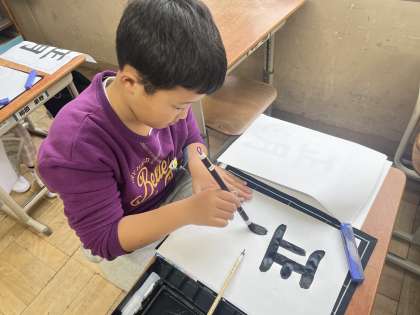 新年をむかえて、はじめて毛筆で文字を書きました。今まで学習したことを生かして「正月」にチャレンジしました。一画一画、力を込めて書く姿が見られました。