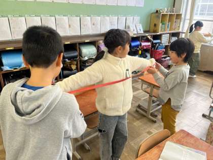 両手を広げた長さを,グループで協力してはかることができました。