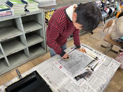 彫りあがった板にインクを付けて、和紙に刷りました。