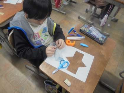 展開図を書いた後は、工作用紙を切り取って、実際に組み立てて三角柱と円柱を作りました。