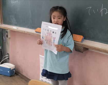 生活科の学校探検で見つけたものを書き、友達に話しました。