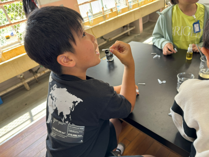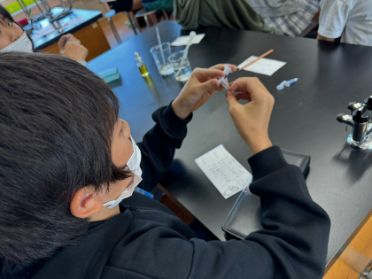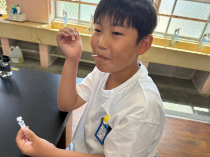 理科「ヒトや動物の体」の学習で、お米を噛む(唾液と混ざる)ことで、どうなるのか考え、実験をしました。綿棒を使って唾液を取り、小さな容器とヨウ素液を使って調べました。