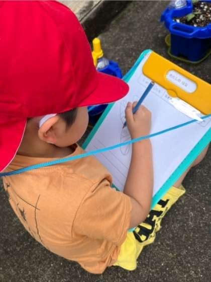 今日は、芽の観察をしました。色、形、大きさなどをよく見て、見つけたよカードにかきました。