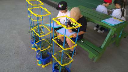 みんなでミニトマトの苗を植えて毎日水やりしています。