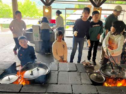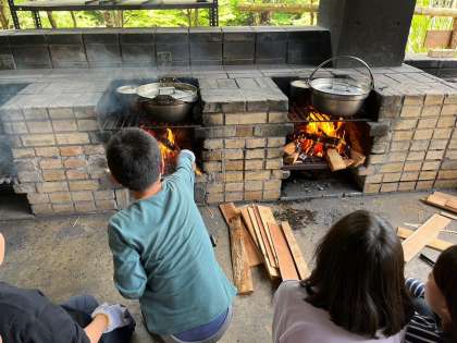 山の家最後の食事は、自分たちで作ります。ひと汗流した後のお仕事…、頑張れ!