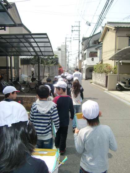 昨日に引き続き,見慣れない地図片手に,「こっちが南で,西で…」とつぶやきながら,歩き回りました。ここは家が多い,郵便局があるなどなど,どの子も気付いたことを熱心に地図に書き込んでいました。