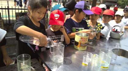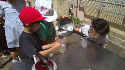 いろんないれものを使ってぴったり1Lをつくろうと、みんなで協力しながら試行錯誤していました。