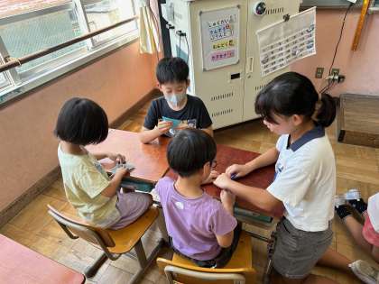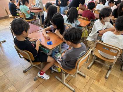 修学旅行に向け、千羽鶴づくりを頑張っています。全校のみんなにも折ってもらっているのですが、この日は1年生に教えながら一緒に作りました。