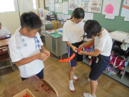 友だちと協力をしながら、折り紙で作った鶴を1つひとつ丁寧に心を込めてつなぎあわせました。