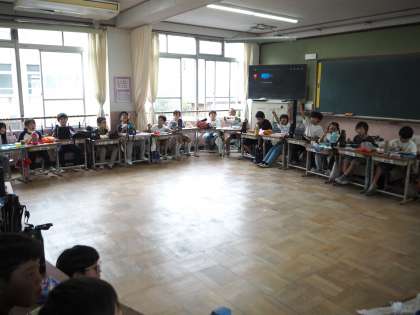 4年生は午前と午後の2グループに分かれて、モノづくりの殿堂・工房学習を行いました。木曜日の事前学習では、京都の企業のことや生活の中にある電子機器には京都で作られた製品が関わっていることを知りました。写真は、午後の部でこれから見学に行こうと意気込む4年生の姿です。美味しいお弁当の準備をありがとうございました。