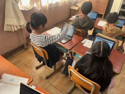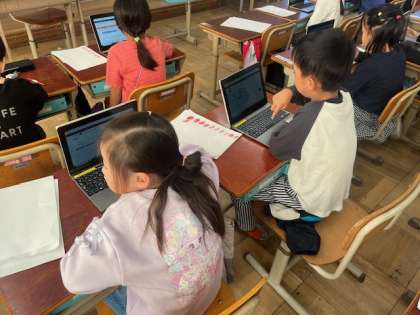 GIGA端末を使って、少しずつ学習をしています。ログインをしたら自分のしたい学習を進めています。ポイントが溜まるので、みんな黙々と頑張っています。