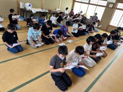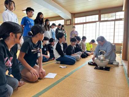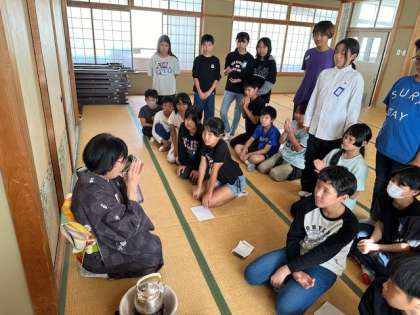 地域女性会の方より茶道体験教室を開いていただきました。まずは茶道の心「和敬清寂」について学び、基本的な作法についても教えてもらいました。