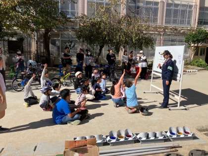 PTAは受付やコースのポイントに立ちお手伝いをしました。おやじの会の方々や伏見警察署の方がコースを設置して下さり、講習では自転車に乗る際の交通ルールや安全確認の仕方等を教えていただきました。