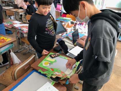 図画工作科「糸のこスイスイ」の学習では、糸のこを使って木の板を切り、パズルをつくりました。今日は、みんなの作品の鑑賞会です。パズルを楽しみながら、作品のよさをたくさん見つけていました。