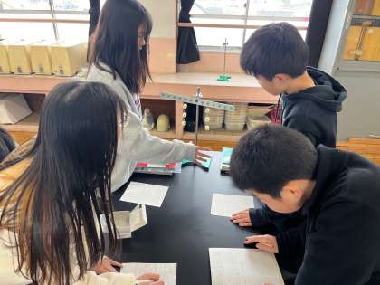 実験用てこにおもりをつるして、重さと位置がどのような関係の時につり合うのかを考えました。