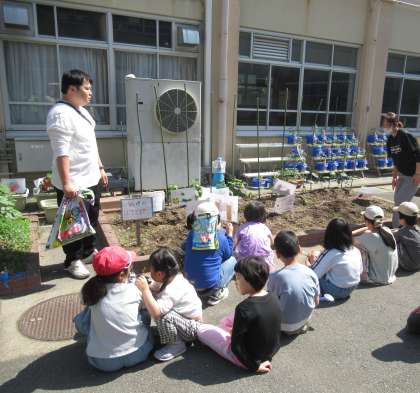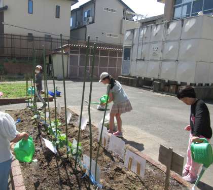 畑仕事で肥料を追加したり、支柱を立てたりして大きくておいしい野菜を育てたいと思います。水やり当番もクラスごとに決めて毎日欠かさずしています。