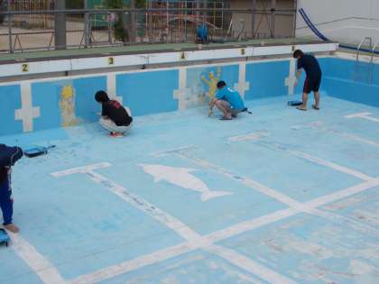 プール学習の開始を目前に,プールにペンキを塗りました。
