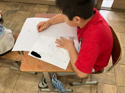 画用紙いっぱいにカニを描いています。