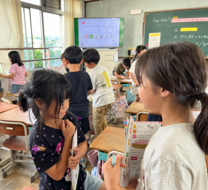 最後の学習では、友だちとお互いに、色を塗ったりんごの数を"How many apples?"と尋ねあう活動をしました。
