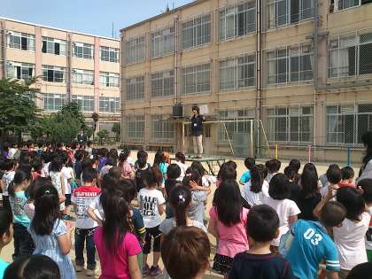 朝会では毎月校長先生からのお話を聞きます。「いつもえがお」という藤ノ森小学校の合言葉から一文字ずつ,今月は「つ」についてのお話でした。