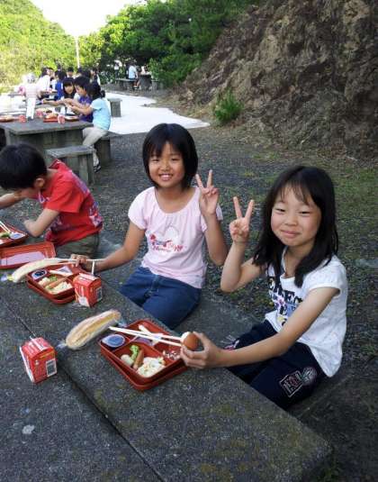今日の朝食は野外炊事場で食べました。しっかり食べて,今日も1日楽しみましょう。