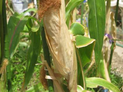 子どもたちは畑の観察をして、「トウモロコシは大きくなったけど、茶色くなった。ポップコーンできるかな?」や「キュウリの葉っぱがパリパリになってる。」「エダマメは緑の実と黄色っぽい実がある。」などそれぞれの野菜の変化を発見していました。
