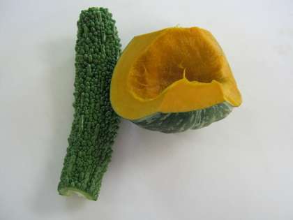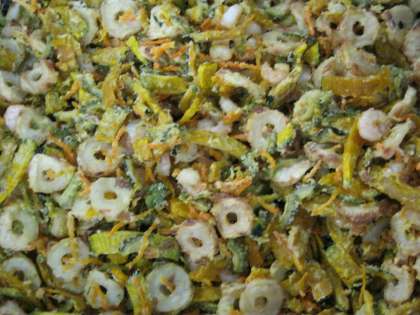 夏野菜は,ゴーヤとかぼちゃを使いました。ゴーヤは苦味があるため,子どもたちに敬遠されがちですが,ゴーヤの苦味成分には,食欲増進・疲労回復などの効果があります。かきあげにすることで,苦味がやわらぎ,食べやすくなりました。