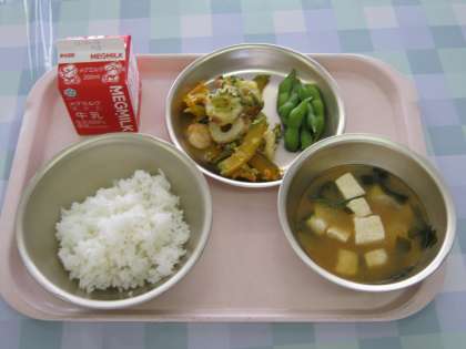 今日の給食は「ごはん,牛乳,夏野菜のかきあげ,えだ豆,みそ汁」でした。