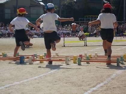 2年生は『ふじのもりンピック』です。障害物をとびこしながらゴールを目指して走ります。