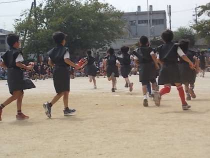 3年の団体演技です。黒い衣装を身につけて手には鳴子をもって踊ります。引き締まったカッコいい演技です。
