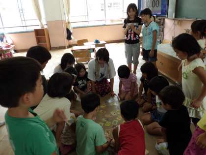 昼休みに,6年生が遊びに来てくれました。1年生は6年生のことが大好きなので,とても楽しそうでした!一緒にかるたをして遊びました。