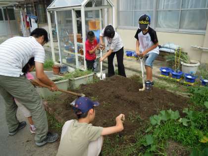 早速、みんなで雑草をぬき、畑を耕し、肥料を入れて畝作りをしました。