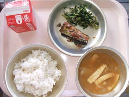 今日の給食は,『麦ごはん・牛乳・さんまのしょうが煮・だいこん葉のごまいため・みそ汁』です。