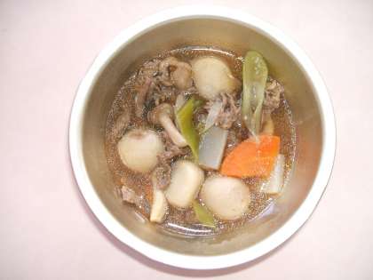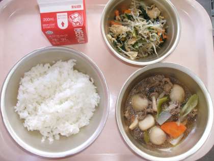 給食では,牛肉・にんじん・里芋・白ねぎ・しめじ・こんにゃくをたっぷりの煮汁でじっくり煮込みました。具だくさんの汁物のような,薄味の煮ものです。煮汁も野菜の旨味が出て,やわらかい味で美味しかったです。