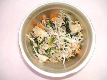 副菜は,もやし・小松菜・にんじん・油揚げのはいった「もやしの煮びたし」です。削り節のおだしで,煮びたしにしました。