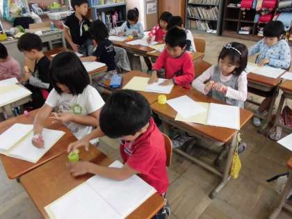 最初に,合奏の担当決めと学芸会ノート作りをしました。