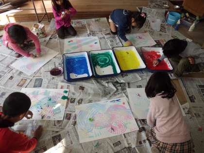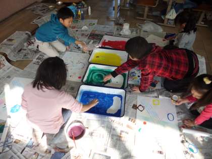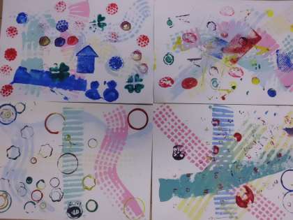 図画工作の時間に、身の回りの材料をつかってスタンプをしました。おうちから大事に持ってきた材料に絵の具をつけ、「どんな模様になるかなあ?」「うまくうつせるかな…」とドキドキわくわくしながらスタンプしていました。「こんな模様ができたよ!」「わあ!その模様いいね!」等、お友達と見せ合いっこをしながら楽しんでいました。