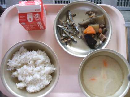 今日の献立は,『ごはん・牛乳・煮しめ・ごまめ・京風みそ汁』です。